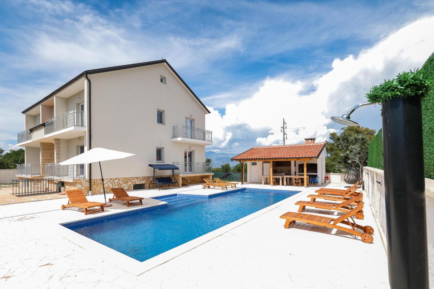 Villa With Pool. This villa provides a private pool. This spacious villa is comprised of 1 living room, 7 separate bedrooms and 4 bathrooms with a shower and free toiletries. Guests will find a stovetop, a refrigerator, a dishwasher and kitchenware in the well-equipped kitchen. The villa also has a barbecue. The air-conditioned villa offers a flat-screen TV with satellite channels, a washing machine, a private entrance, a tea and coffee maker as well as garden views. The unit offers 7 beds.