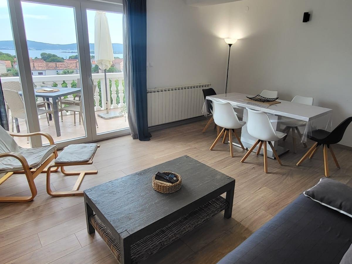 Apartment can accommodate 6 guests. Beds are situated in 2 sleeping rooms, but also in the living room, within 57m2. Guests can use a private terrace to enjoy the warm summer evenings. The apartment offers the sea view. Food can be prepared using barbecue which is shared with other guests too. INCLUDED IN THE PRICE: tourist tax, final cleaning, air-conditioning, central heating, parking, internet, baby cot, additional bed, iron, ironing board, hairdryer. The availability of additional services for your chosen dates of stay, as well as their prices (if none are listed) must be checked ahead of time. Any additional services not shown in the price calculation are payable directly to the property owner and only if used by the visitor.