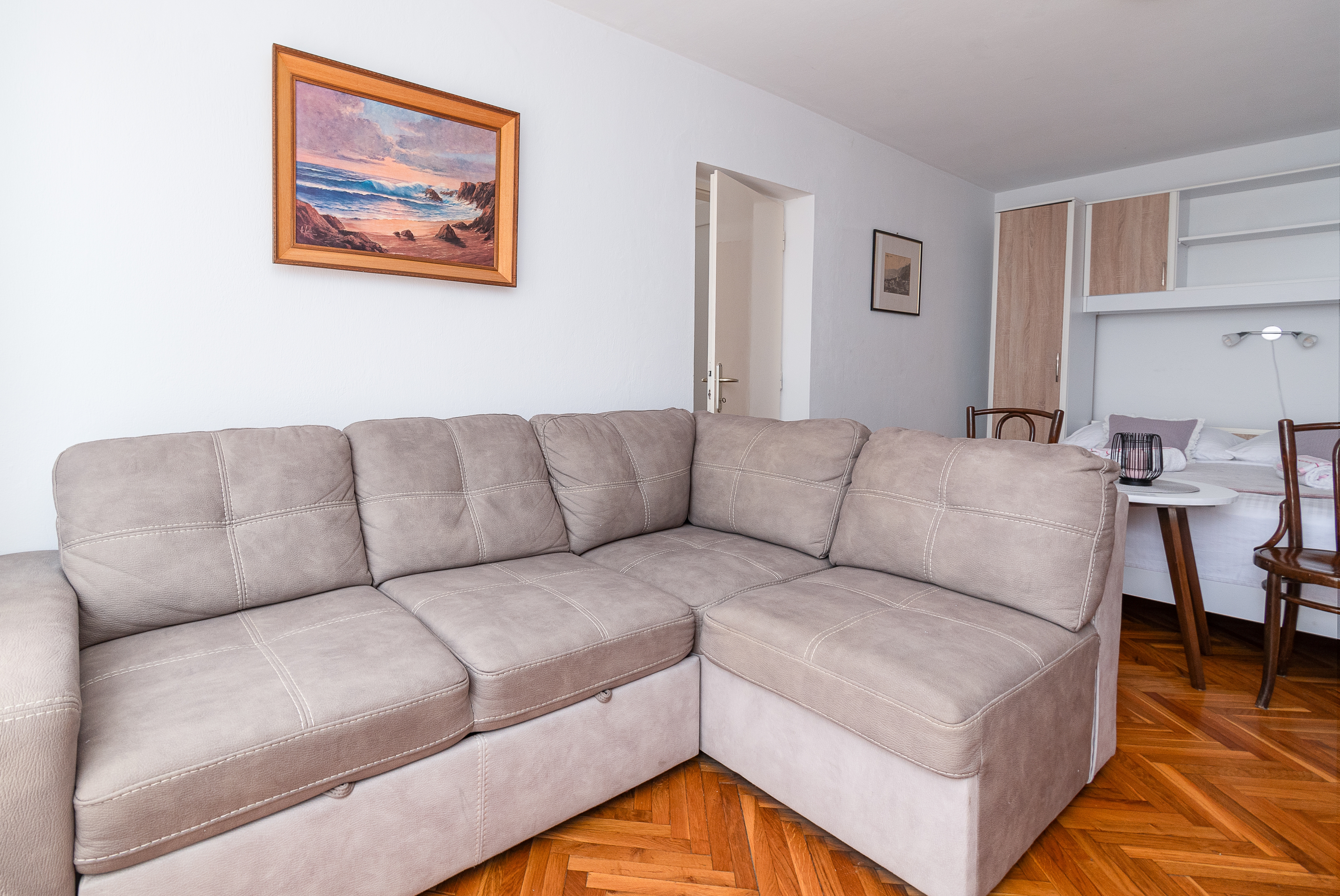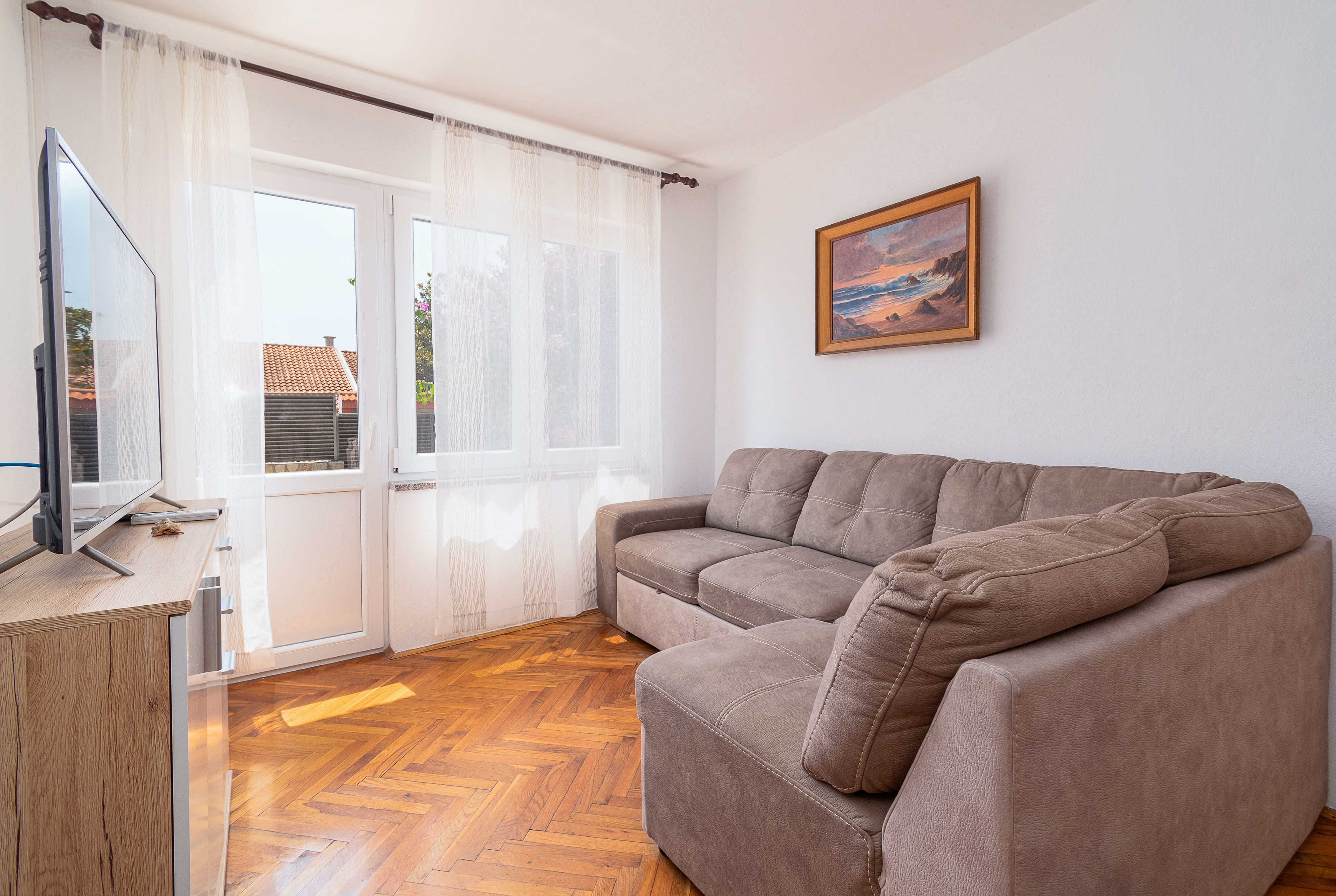 Studio flat can accommodate 4 guests. Beds are situated in 1 sleeping rooms, but also in the living room, within 45m2. Guests can use a private terrace to enjoy the warm summer evenings. For full enjoyment and relaxation there is a private barbecue for this accommodation guests only. This accommodation unit welcomes pets at an additional charge. INCLUDED IN THE PRICE: tourist tax, final cleaning, air-conditioning, parking, internet, iron, ironing board, hairdryer. OPTIONAL ADDITIONAL COSTS: pets (€8.00 per night). The availability of additional services for your chosen dates of stay, as well as their prices (if none are listed) must be checked ahead of time. Any additional services not shown in the price calculation are payable directly to the property owner and only if used by the visitor. Discounts to the base price: free day 14=13 (for reservations of 14 or more days you get one free day for the stay until 31122026).