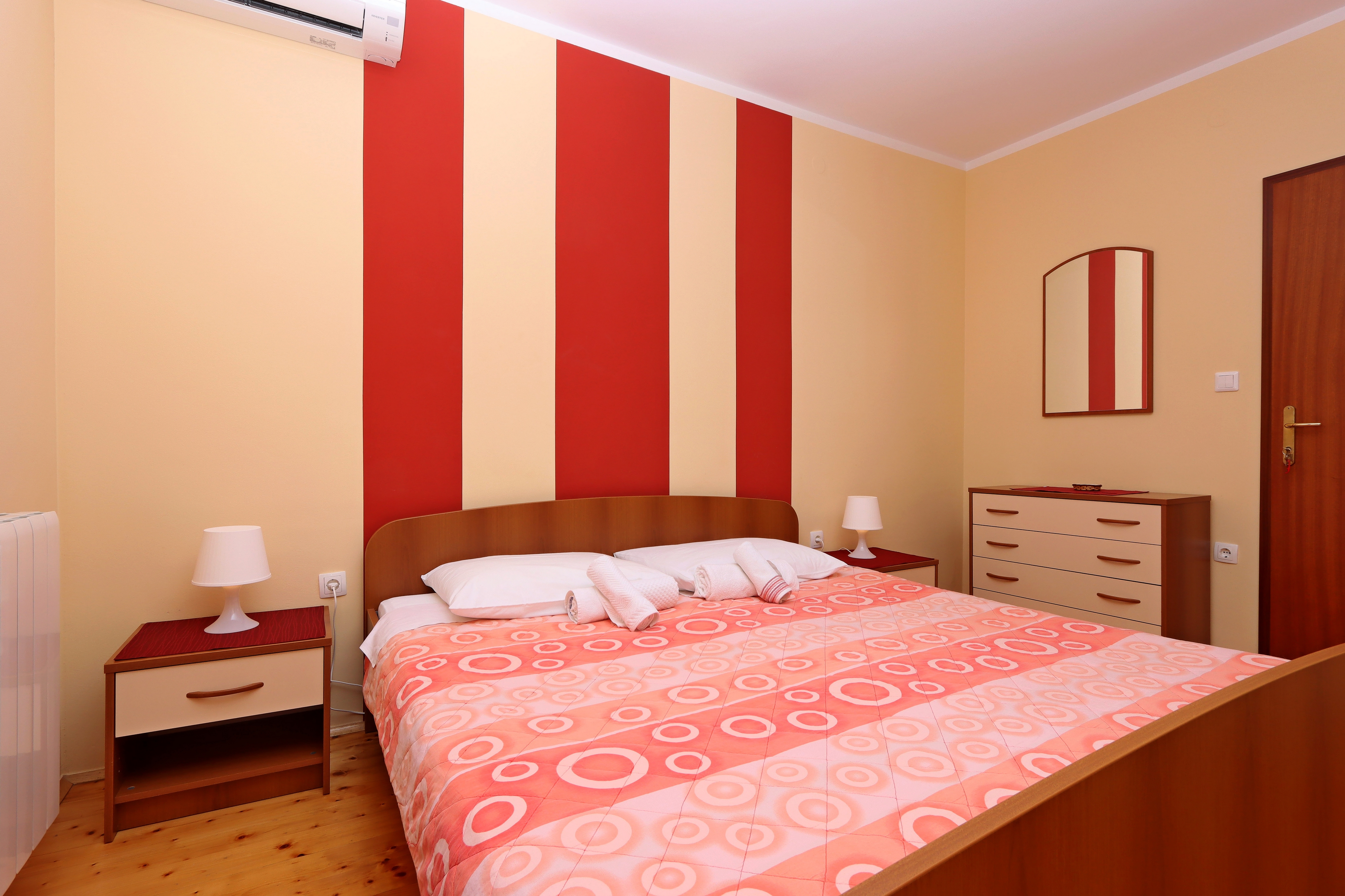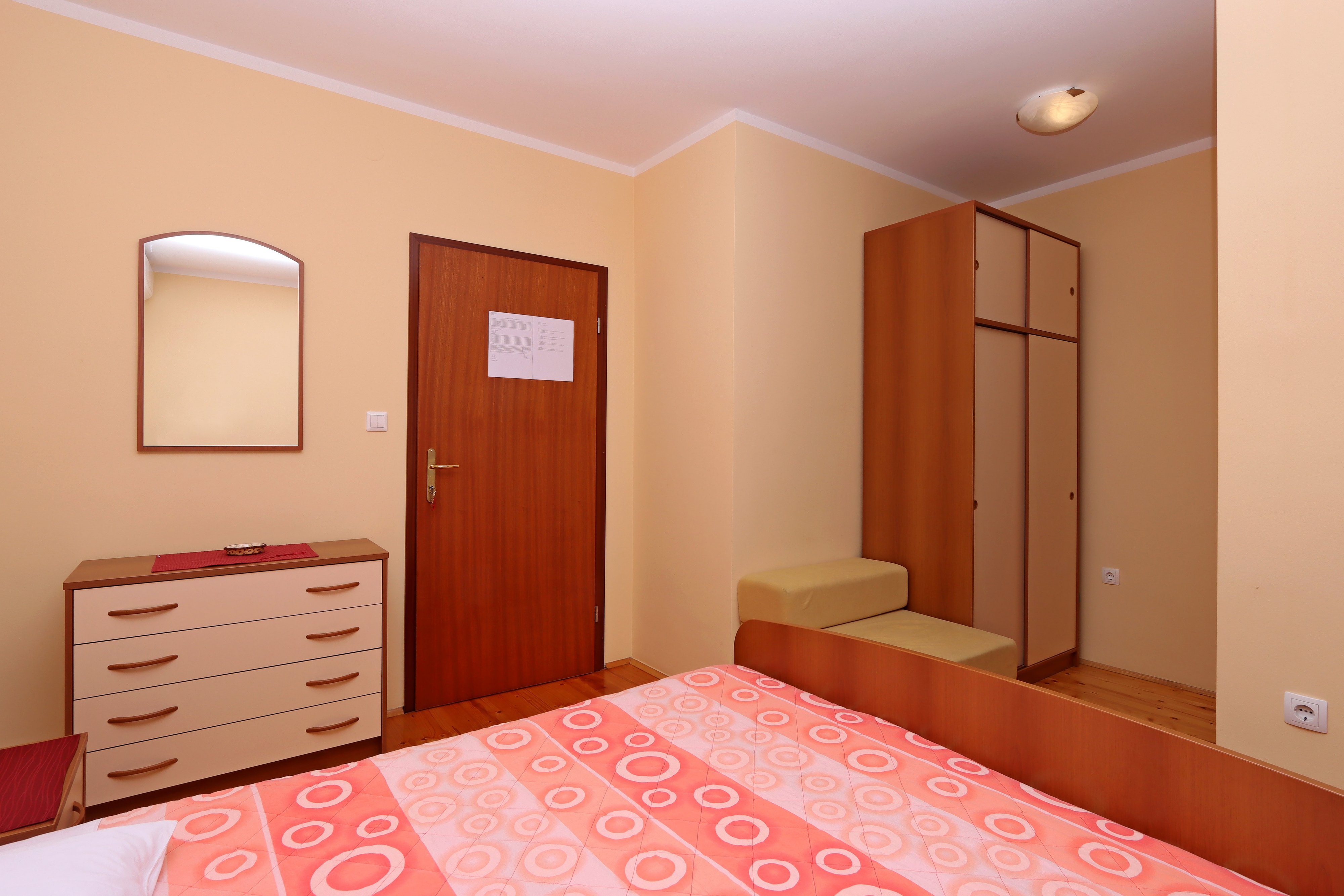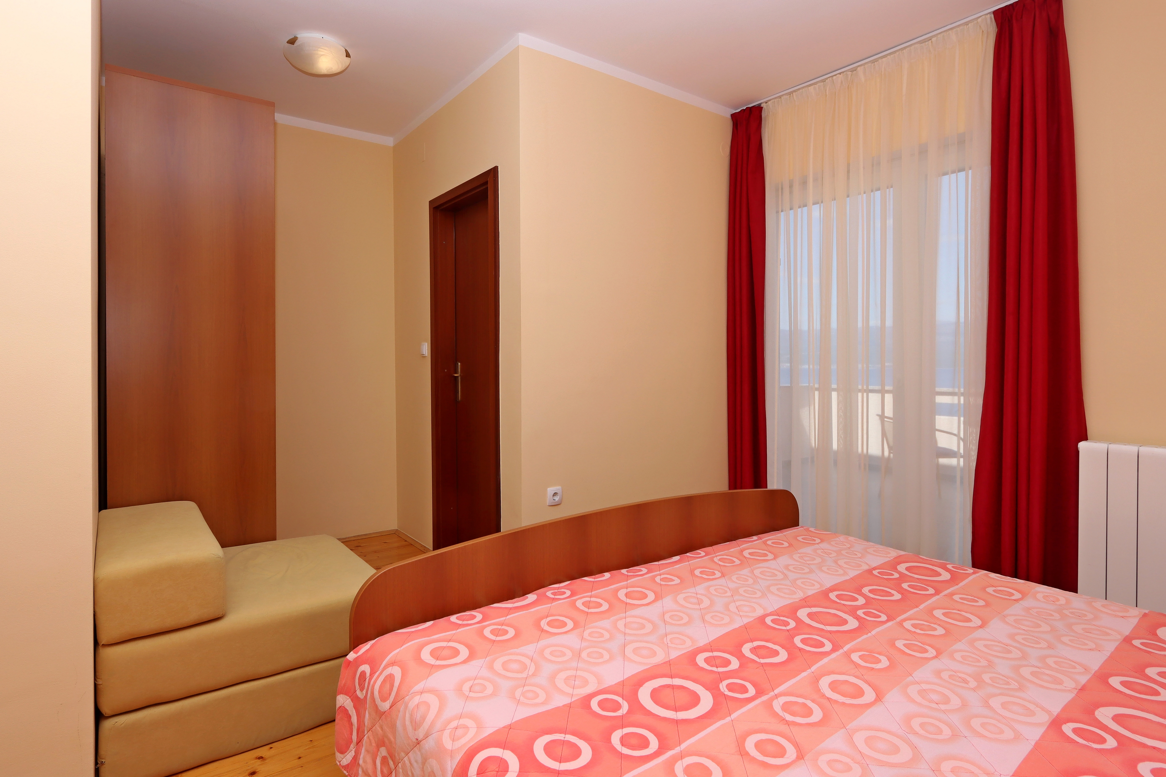 Room can accommodate 2 guests. Beds are situated in 1 sleeping rooms, within 12m2. Guests can use a private terrace to enjoy the warm summer evenings. The room offers the sea view. Food can be prepared using barbecue which is shared with other guests too. Reserved accommodation unit is a room with its own bathroom and there is no usage of kitchen. INCLUDED IN THE PRICE: tourist tax, final cleaning, central heating, parking, internet, iron, ironing board, hairdryer. OBLIGATORY ADDITIONAL COSTS: short stay fee (surcharge depending on a number of booked nights: 30% - 1, 20% - 2, 10% - 3). OPTIONAL ADDITIONAL COSTS: air-conditioning (€7.00 per night), laundry (€10.00 washing). The availability of additional services for your chosen dates of stay, as well as their prices (if none are listed) must be checked ahead of time. Any additional services not shown in the price calculation are payable directly to the property owner and only if used by the visitor.