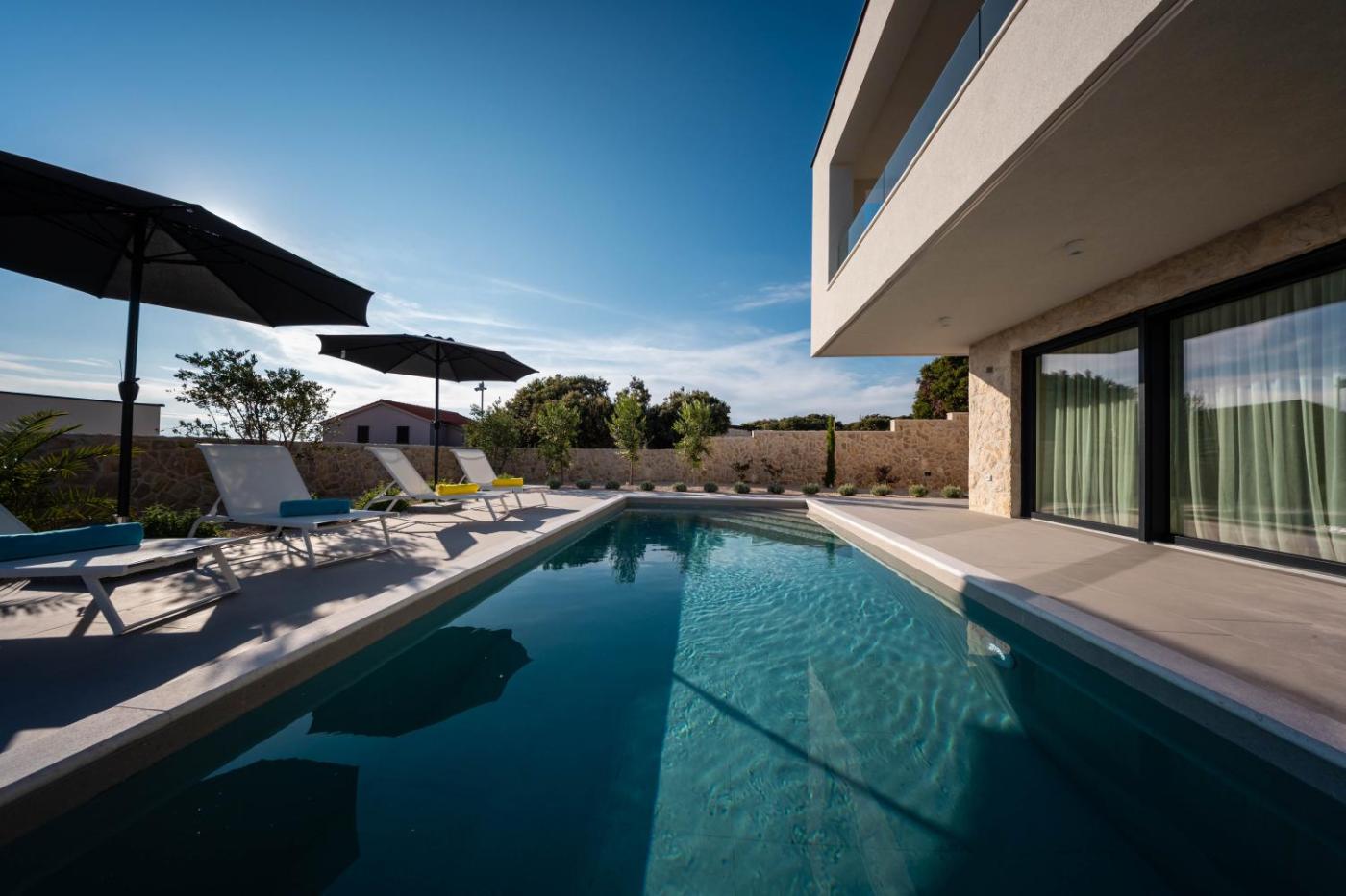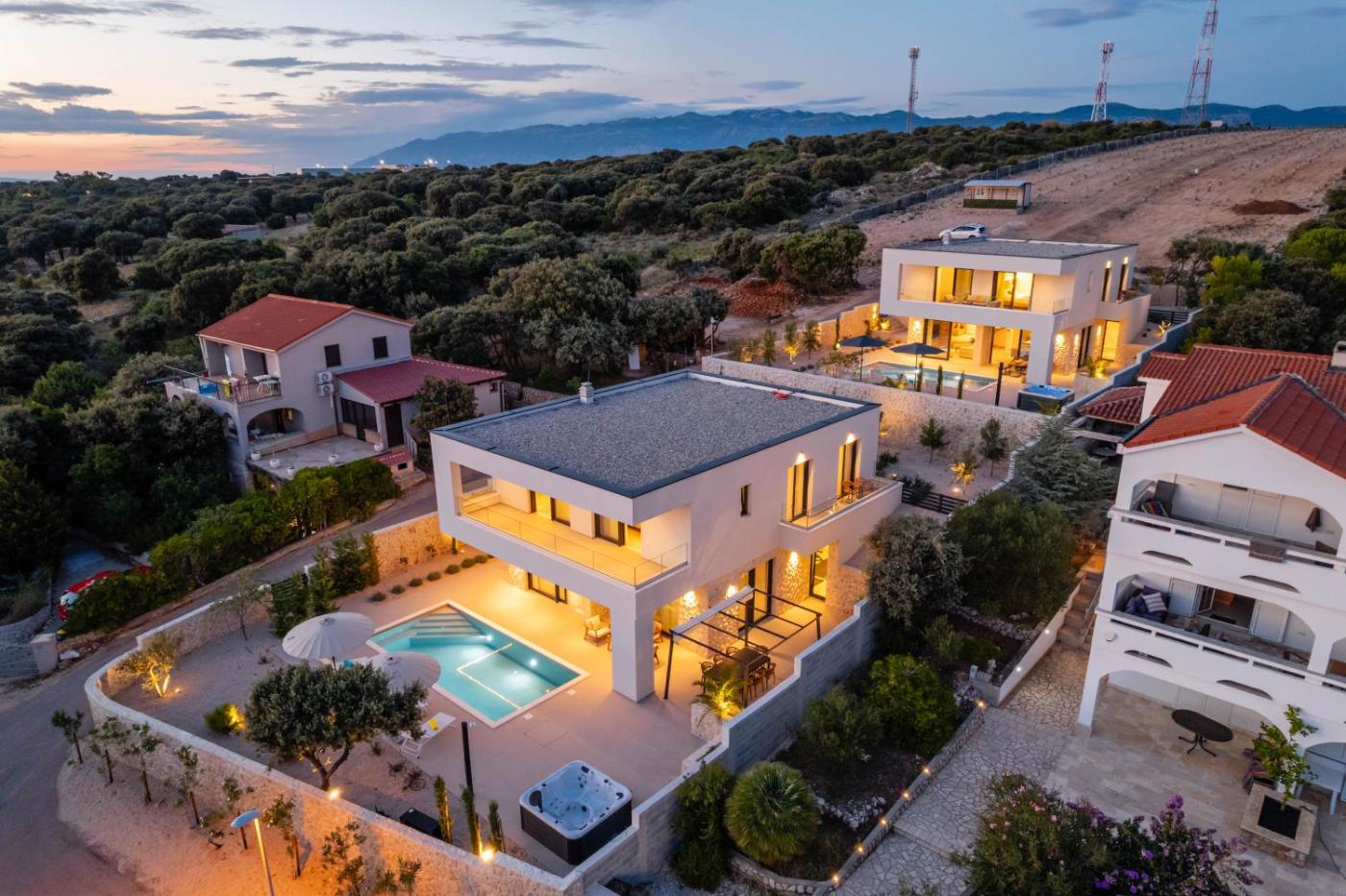 Villa Sempreviva and Salvia - Sea View Luxury Retreats offers a sauna and a hot tub, as well as air-conditioned accommodation in Mandre, less than 1 km from Mala Mandra Beach. With sea views, this accommodation features a balcony and a swimming pool. There is an outdoor fireplace and guests can make use of free WiFi, free private parking and an electric vehicle charging station.