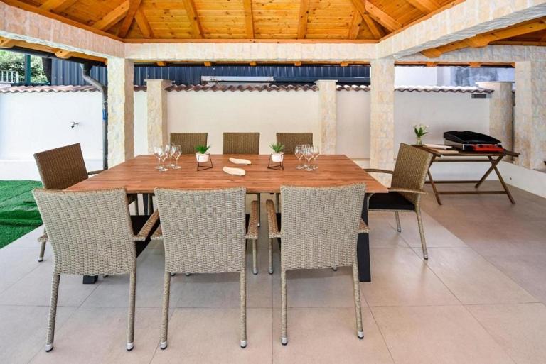 The villa has 2 separate bedrooms, 2 bathrooms, a fully equipped kitchen with a dining area, a an outdoor dining area and a flat-screen TV.