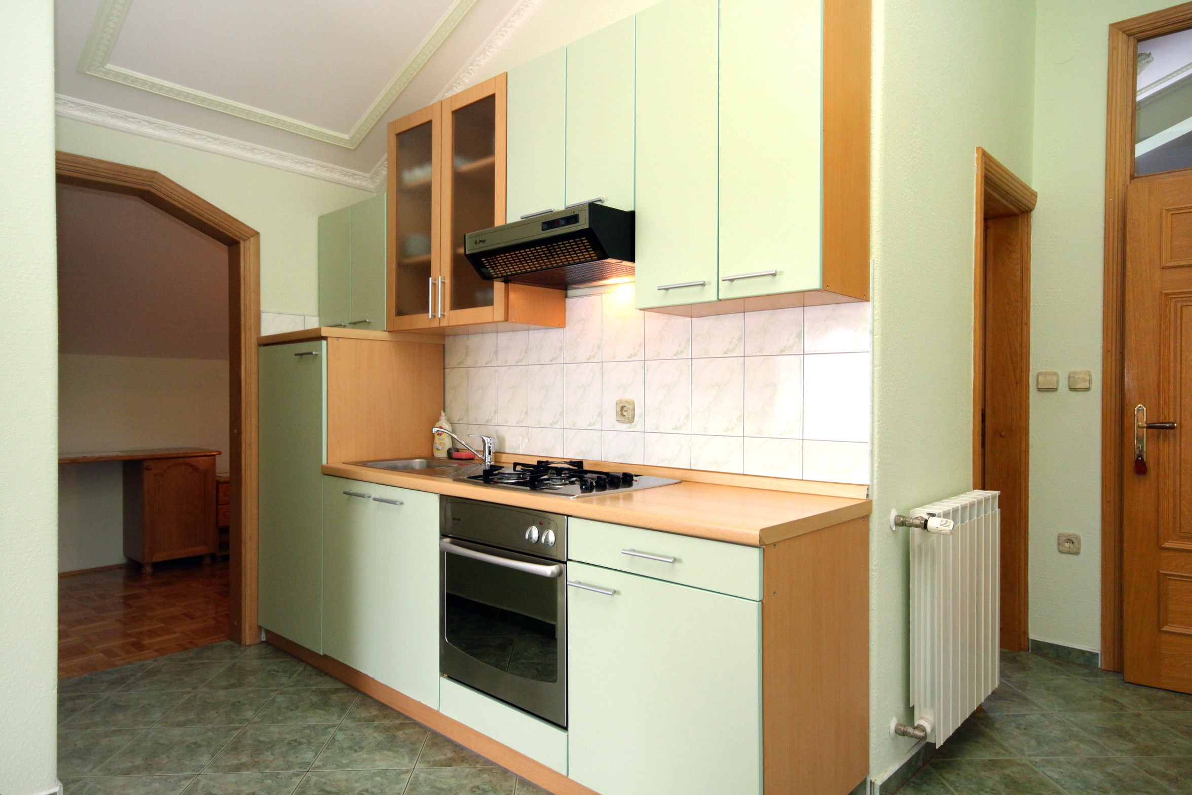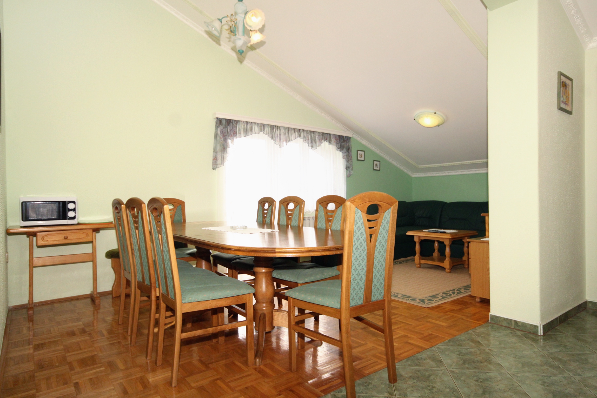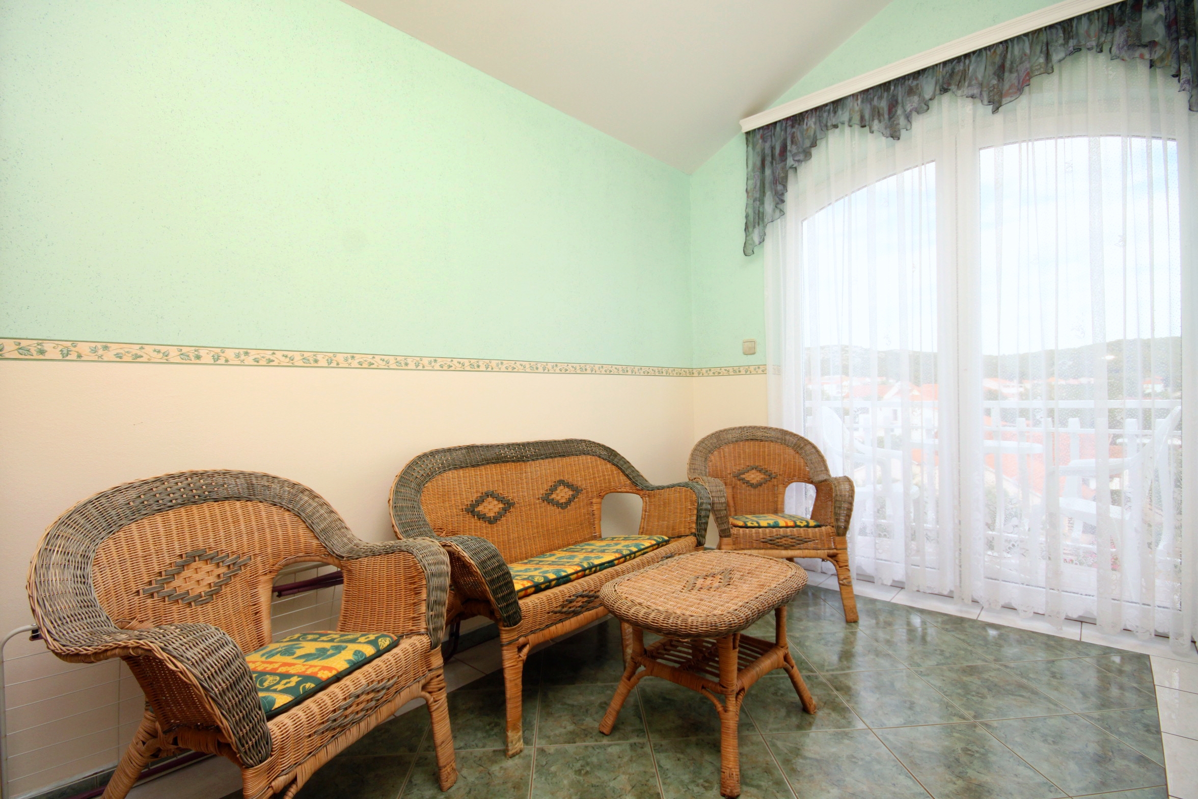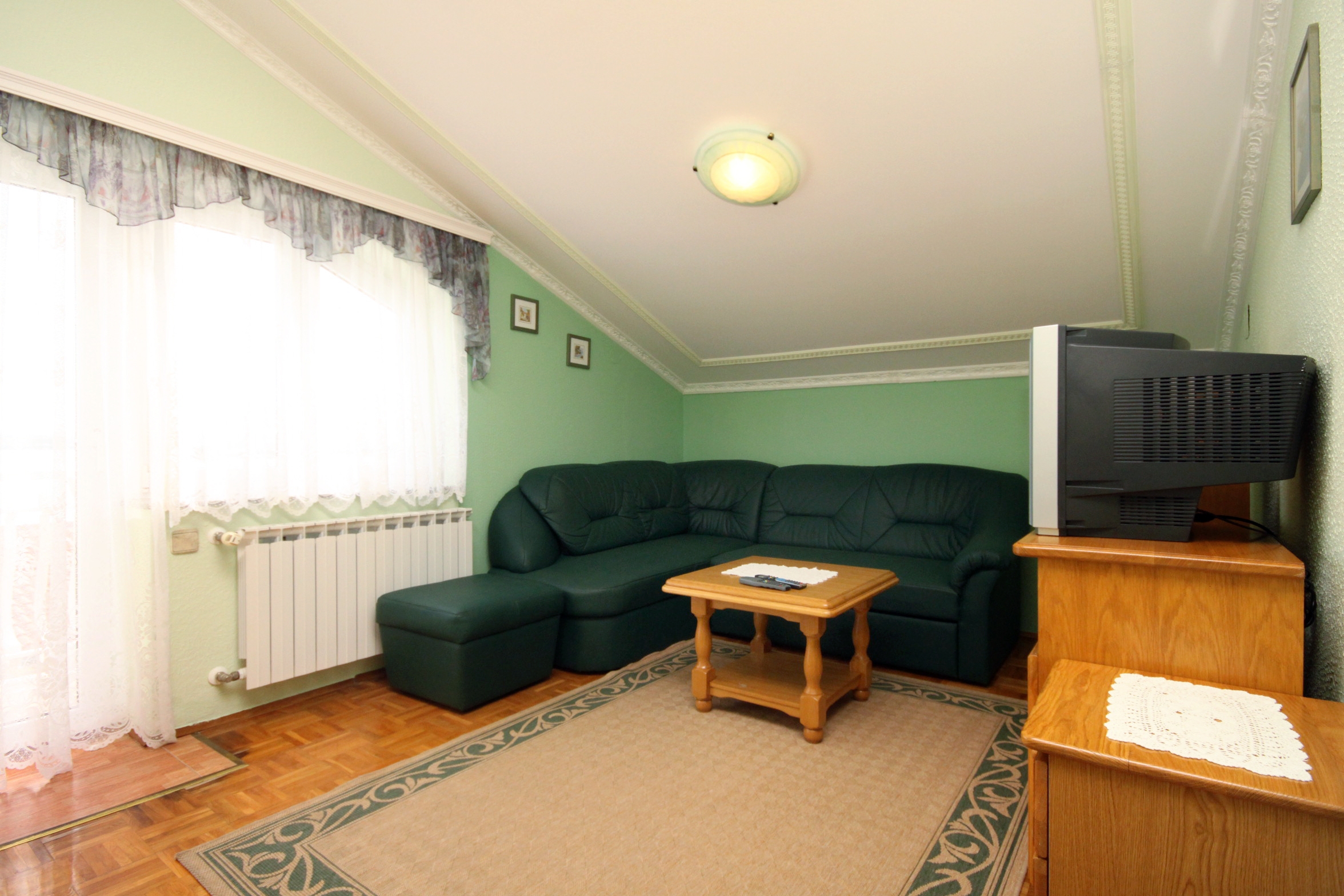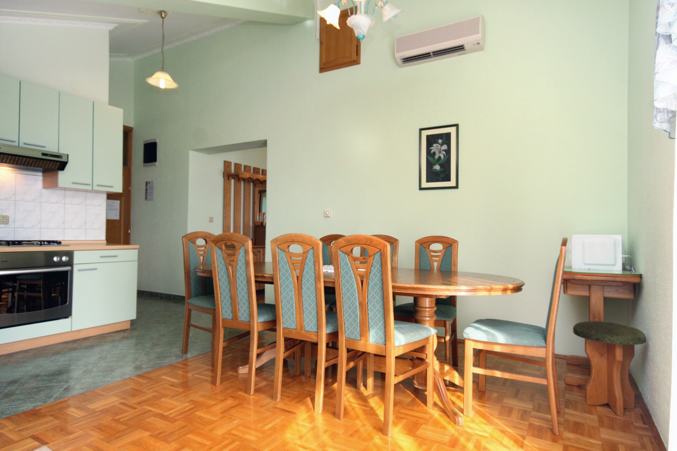 Apartment can accommodate 9 guests. Beds are situated in 4 sleeping rooms, but also in the living room, within 98m2. Guests can use a private balcony to enjoy the warm summer evenings. The apartment offers the sea view. Food can be prepared using barbecue which is shared with other guests too. Shared pool is on disposal during stay. INCLUDED IN THE PRICE: tourist tax, final cleaning, air-conditioning, central heating, pool, parking, internet, baby cot, additional bed, iron, ironing board, hairdryer, sunshade, sunchairs. OBLIGATORY ADDITIONAL COSTS: short stay fee (surcharge depending on a number of booked nights: 30% - 1, 20% - 2, 10% - 3). OPTIONAL ADDITIONAL COSTS: breakfast (€10.00, a 50% discount for children aged 4 to 12 years, Children up to age 4 free of charge), half-board (€25.00, a 50% discount for children aged 4 to 12 years, Children up to age 4 free of charge), full board (€40.00, a 50% discount for children aged 4 to 12 years, Children up to age 4 free of charge). The availability of additional services for your chosen dates of stay, as well as their prices (if none are listed) must be checked ahead of time. Any additional services not shown in the price calculation are payable directly to the property owner and only if used by the visitor.