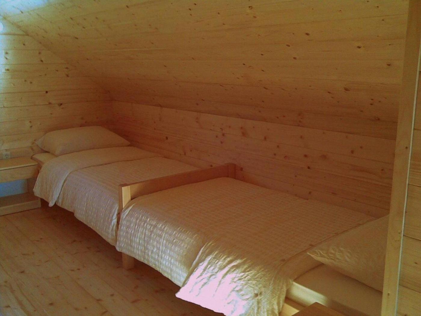 Two-Bedroom Holiday Home. This is a small wooden house with a kitchen, a bathroom and one double bedroom on the ground floor and another bedroom on the first floor with 2 single beds. The detached house is situated 100 meters off the local street and 3 km from main road, in a very quiet area. It is surrounded by gardens, meadows and forests. Guests can enjoy full privacy, long walks and a quality vacation in a healthy environment.