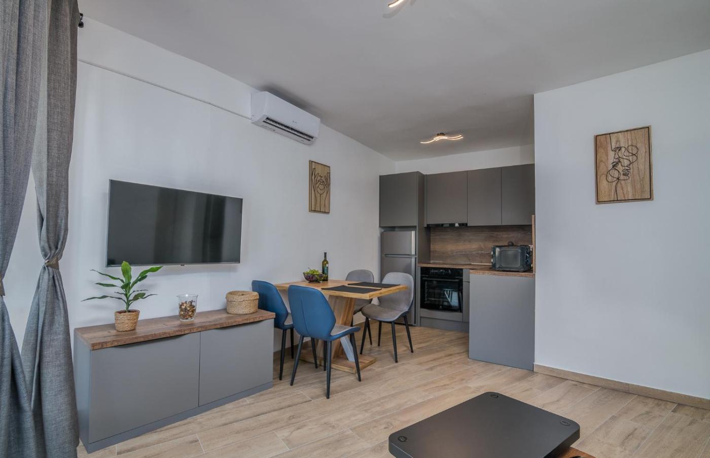 One-Bedroom Apartment. This air-conditioned apartment features 1 living room, 1 separate bedroom and 1 bathroom with a shower. Guests can make meals in the kitchen that has a stovetop, a refrigerator, a dishwasher and kitchenware. This apartment has a tea and coffee maker, flat-screen TV with streaming services, sea views, as well as winechampagne for guests. The unit has 2 beds.
