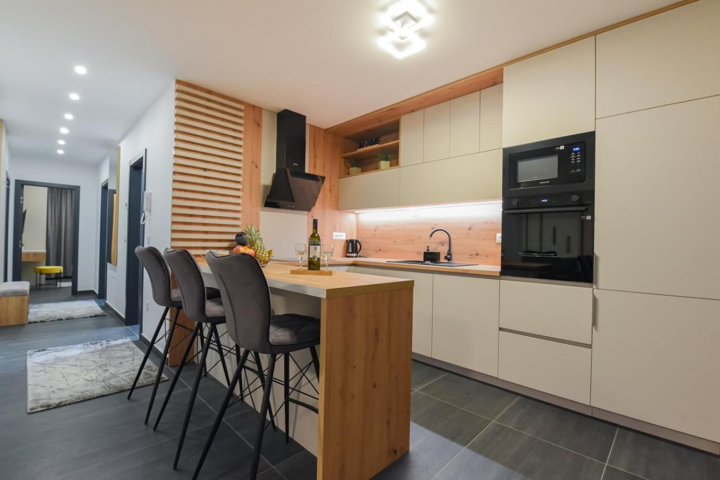 Three-Bedroom Apartment. This spacious apartment consists of 1 living room, 3 separate bedrooms and 1 bathroom with a shower and a hairdryer. In the well-equipped kitchen, guests will find a stovetop, a refrigerator, a dishwasher and kitchenware. This apartment features air conditioning, a washing machine, flat-screen TV, as well as winechampagne for guests. The unit offers 3 beds.