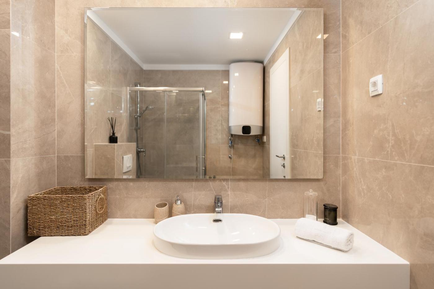 Two-Bedroom Apartment. Boasting a private entrance, this spacious apartment also includes 2 bedrooms, a seating area and 1 bathroom with a shower and a hairdryer. Meals can be prepared in the well-fitted kitchen, which is fitted with a stovetop, a refrigerator, a dishwasher and kitchenware. The air-conditioned apartment offers a flat-screen TV with streaming services, a washing machine, soundproof walls, a tea and coffee maker as well as sea views. The unit has 2 beds.