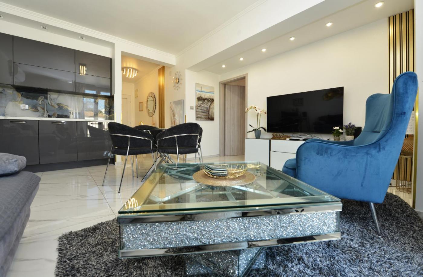 One-Bedroom Apartment. This apartment consists of 1 living room, 1 separate bedroom and 1 bathroom with a walk-in shower and free toiletries. The apartments kitchen, which features a refrigerator, is available for cooking and storing food. The air-conditioned apartment provides a flat-screen TV, a washing machine, a tea and coffee maker, a seating area as well as garden views. The unit offers 2 beds.